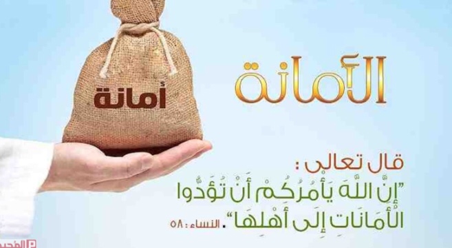 • الأمانة واحدة من أجمل الأخلاق التي يتحلّى بها الإنسان، ولهذا فقد حث عليها الإسلام، حيث وردت في القُرآن الكريم في عدة مواضع، وقد سُمي الرسول الكريم بالصادق الأمين، قبل أن يُصبح نبياً، وهذا دليل على أنه خُلُق عطيمالشأن. عكس الأمانة الخيانة، وهي خُلق قبيح يخلق العديد من المشاكل بين الناس على مُختلف معتقداتهم.